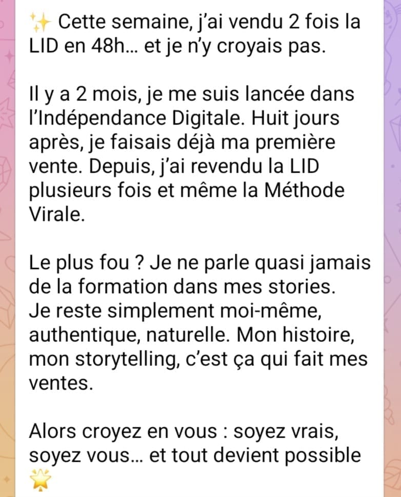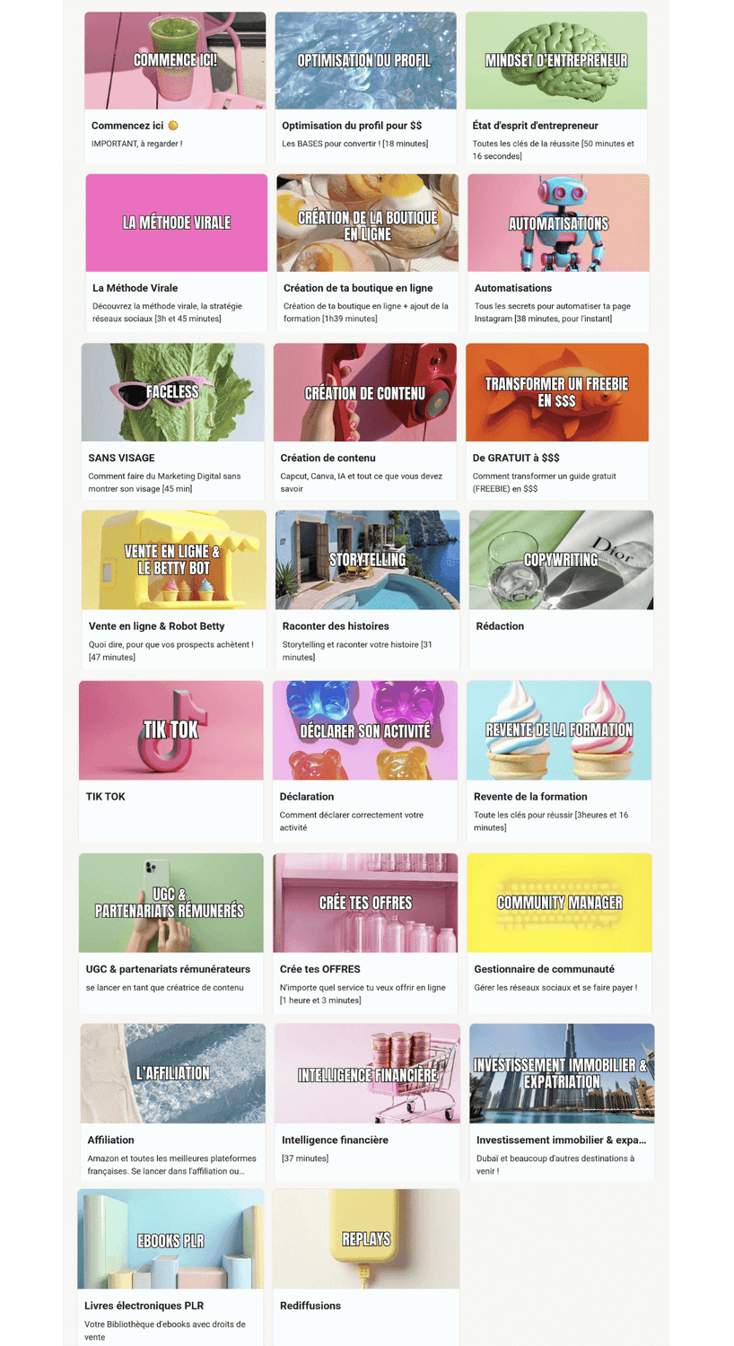 Une formation conçue par une entrepreneuse à succès, riche de 10 ans d’expérience sur les réseaux sociaux, qui révèle des méthodes et stratégies concrètes pour offrir à chacun l’opportunité de créer des revenus en ligne, même en partant de zéro.