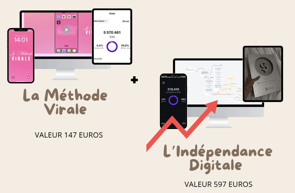 Tu obtiens également La Méthode Virale, une formation de 3h45 pour apprendre à te faire connaître sur les réseaux sociaux et rendre ton contenu viral.